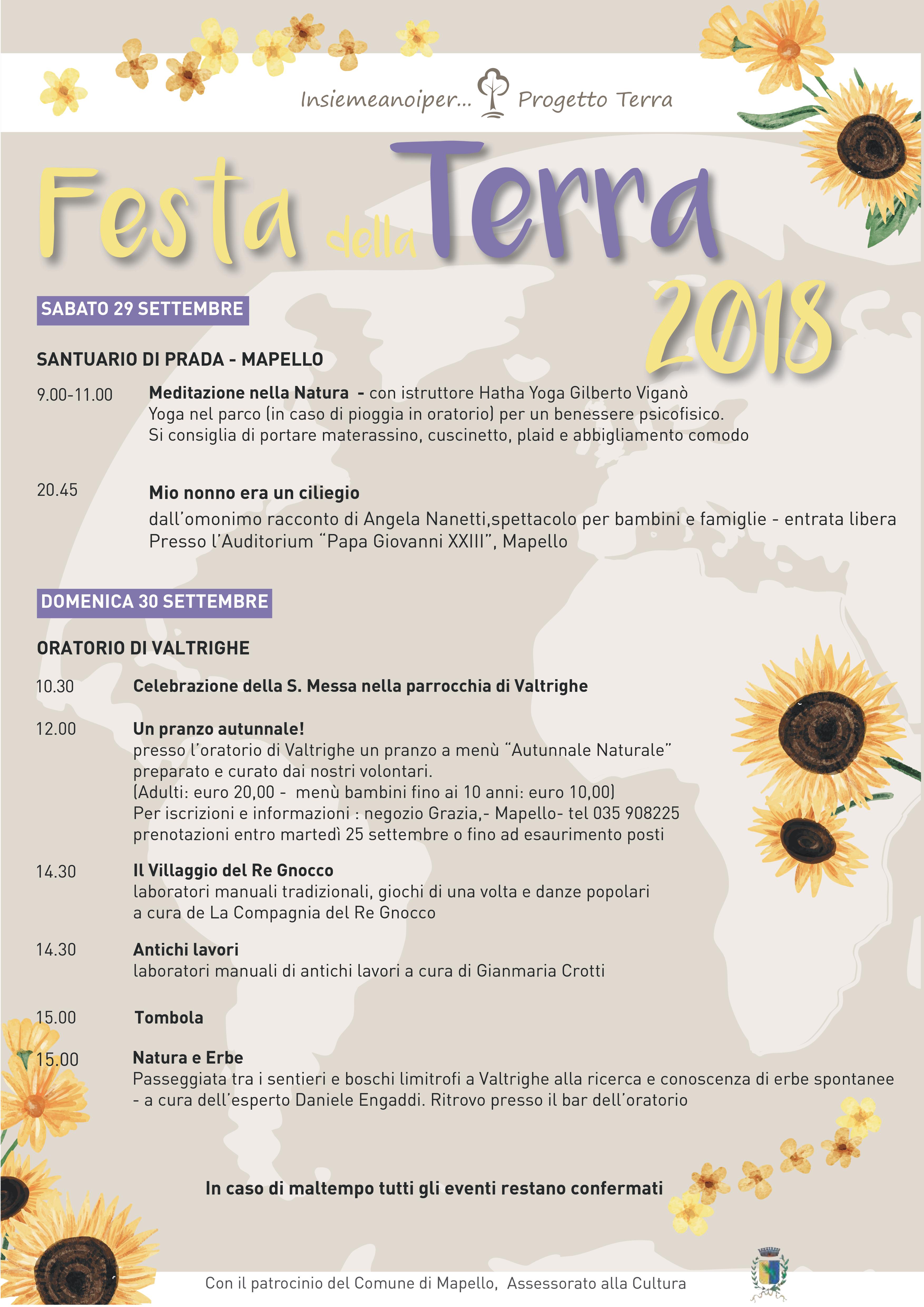 Dopo la due giorni che a fine luglio ha portato centinaia di persone a godere della bellezza serale del Parco del Santuario di Prada, prosegue la Festa della Terra, la manifestazione in onore della natura giunta alla terza edizione e organizzata dall’associazione ‘Insiemeanoiper… Progetto Terra’ di Mapello, in collaborazione con l’associazione culturale per il ballo popolare ‘La Compagnia del Re Gnocco’.