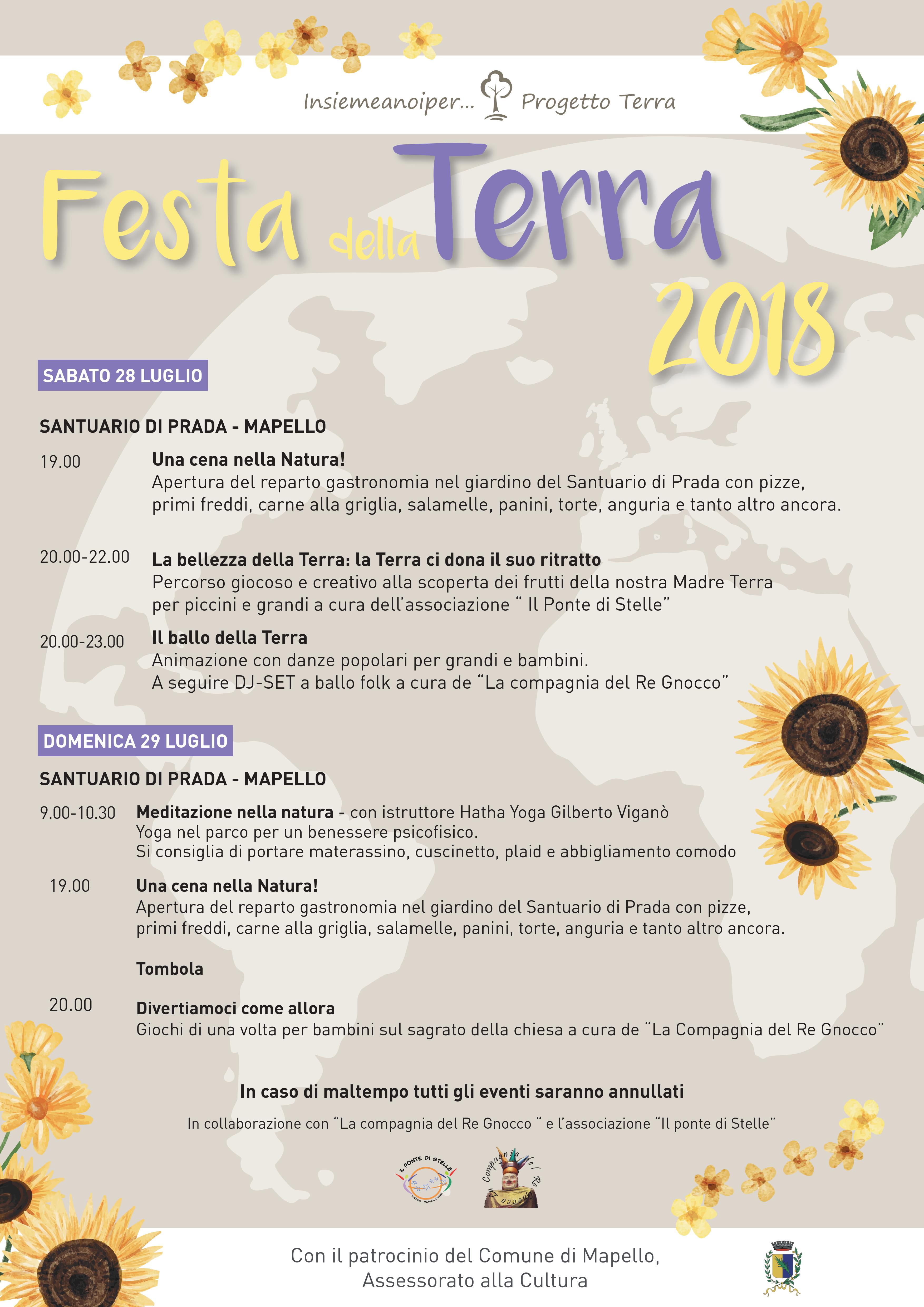 Anche quest’anno sarà lo splendido Santuario di Prada (Mapello), con il suo bel parco, a ospitare, nel fine settimana del 28 e 29 luglio, la Festa della Terra, manifestazione in onore della natura giunta alla terza edizione e organizzata dall’associazione ‘Insiemeanoiper… Progetto Terra’ di Mapello, in collaborazione con l’associazione culturale per il ballo popolare ‘La Compagnia del Re Gnocco’ e l’associazione ‘Il Ponte di Stelle’.