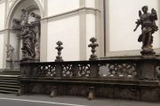 La balaustra con le sue nove statue, scolpite negli anni 1745 e 1748 da Antonio Maria Pirovano, deve essere urgentemente restaurata: la pietra morbida utilizzata da questo Maestro del barocchetto, che ha lasciato opere in tutta la bergamasca  (Mapello, Verdellino e Stezzano, Sorisole e Treviglio. Gromlongo, Brembate Sopra, Chiuduno, Zanica, Calcinate, S. Andrea di Sforzatica e S. Maria d’Oleno, S. Caterina e S. Grata in Borgo Canale in Bergamo, Almenno S. Bartolomeo, Premolo, Basilica di Alzano Lombardo, Cologno al Serio, Villasola di Cisano, Bonate Sopra, Somasca, Pontirolo, Poscante, Gazzaniga, Vertova, Urgnano, Fara d’Adda), non ne ha aiutato la conservazione nei secoli.