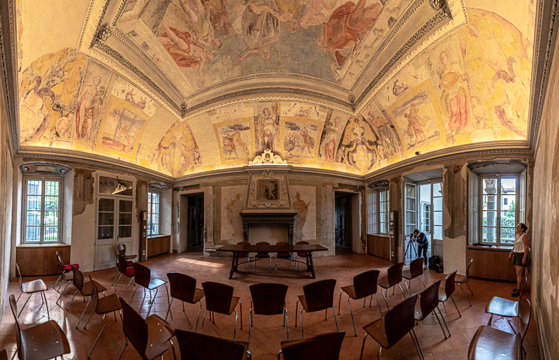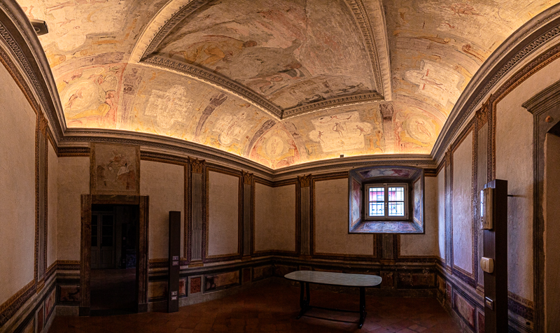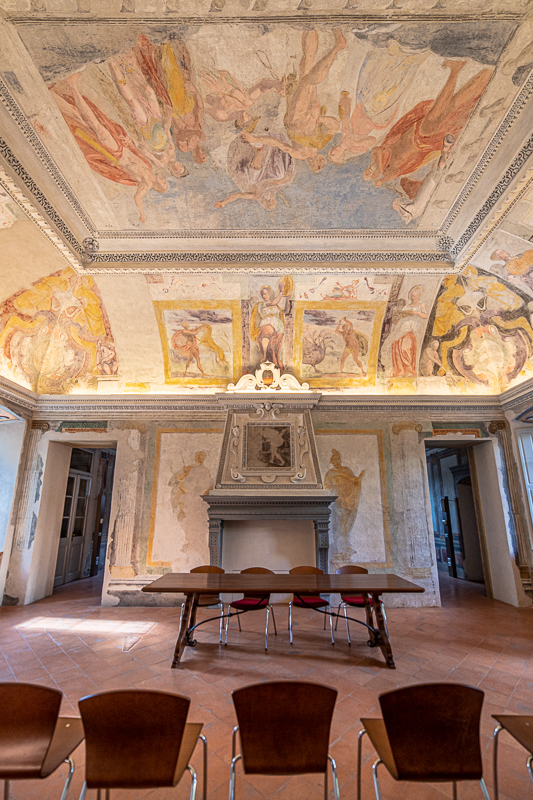 Attraverso il portico, affrescato con motivi a grottesca e lunette, si accede alle sale decorate alla fine del XVI secolo dal pittore bergamasco Giovan Paolo Cavagna: il salone dedicato a Ercole e le salette minori a Susanna, Giuditta e Apollo.